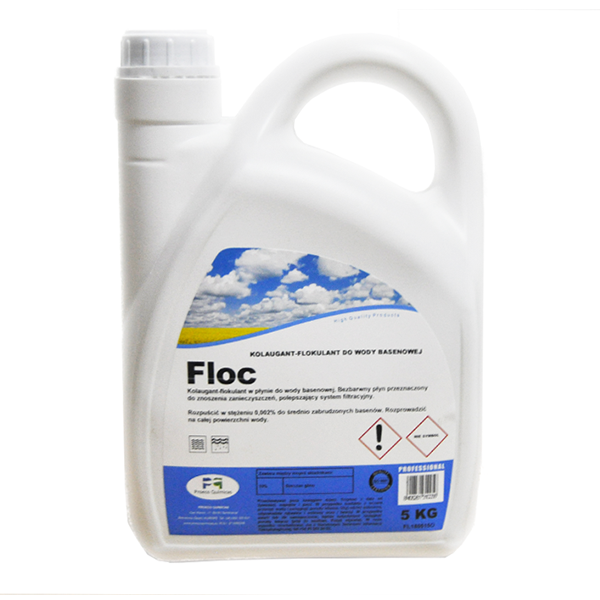 Flokulant w płynie polepszający system filtracyjny w basenach. Niektóre zabrudzenia ciężko wyłapać poprzez system filtracyjny, przy stosowaniu pompy piaskowej mniejsze elementy wracają z filtra do niecki basenowej. By temu zapobiec wystarczy zastosować preparat FLOC który 'zlepia’ mniejsze cząsteczki w większe, przez co stają się łatwiejsze do wyłapania przez filtr. Najlepiej stosować wieczorem gdy uregulujemy poziom pH zostawiając włączony system filtrujący.